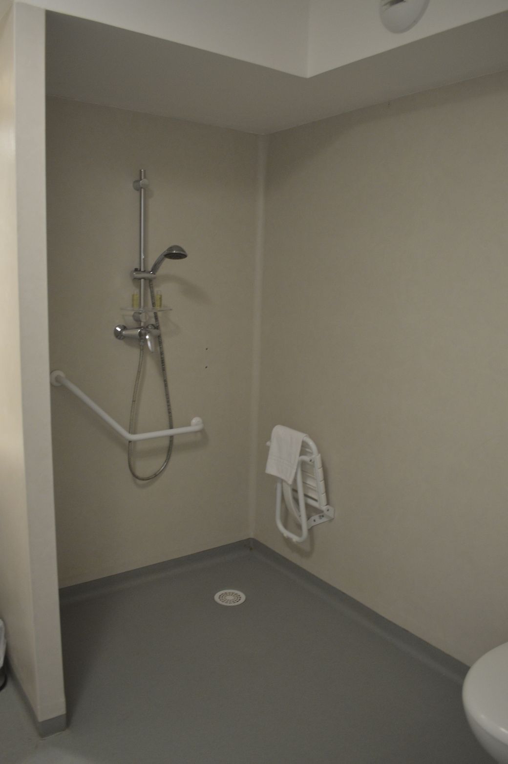 Nous avons séjourné deux nuits dans un appartement PMR composé d’une grande salle de douche à l’italienne (avec barre de maintien), WC rehaussé et lavabo adapté, d’une kitchenette, d’un lit deux places, d’une petite table, d’un bureau avec télévision et un petit balcon non accessible.